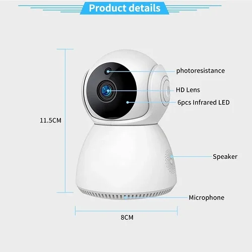• Funkcije: bežično WiFi povezivanje sa mobilnim telefonom, PIR detekcija pokreta ljudskog tela, dvosmerni glasovni interkom, HD noćni vid, PTZ rotacija, cloud skladištenje, skladištenje na kartici, detekcija pokreta